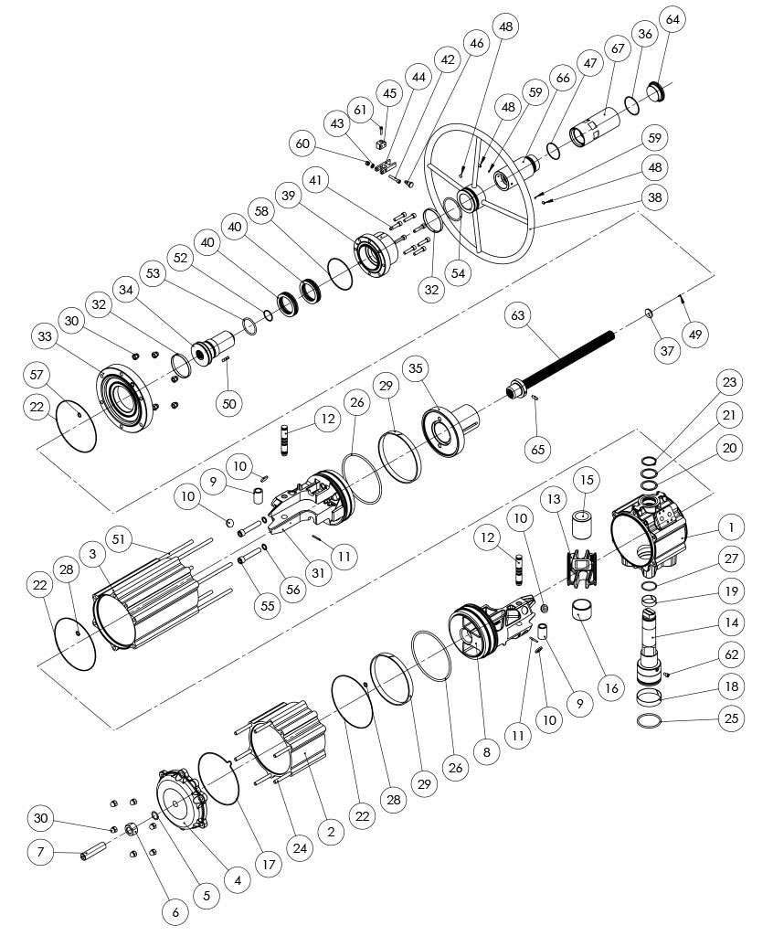Bei Bedarf kann der von unser hergestellte pneumatische Stellantrieb mit Vierteldrehung mit einem Handantrieb ausgestattet werden. Der Antrieb kann sowohl in die doppeltwirkende als auch in die einfachwirkende Ausführung integriert werden. Damit das System ordnungsgemäß funktioniert und die mechanische Integrität der Vorrichtung gewährleistet ist, muss sichergestellt sein, dass der pneumatische Antrieb von den Druckluftversorgungsleitungen getrennt ist, bevor Arbeiten mit dem Handantrieb ausgeführt werden können. Der Handantrieb wirkt auf das primäre mechanische Getriebe des pneumatischen Stellantriebs und erzeugt bei Anlaufmomenten am Handrad gemäß der Norm EN 12570 Ausgangsdrehmomente, die dem Nenndrehmoment des Stellantriebs selbst entsprechen.